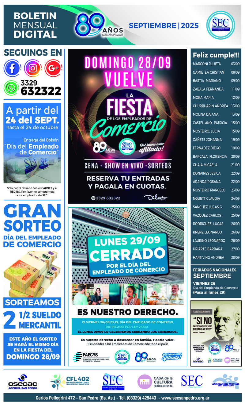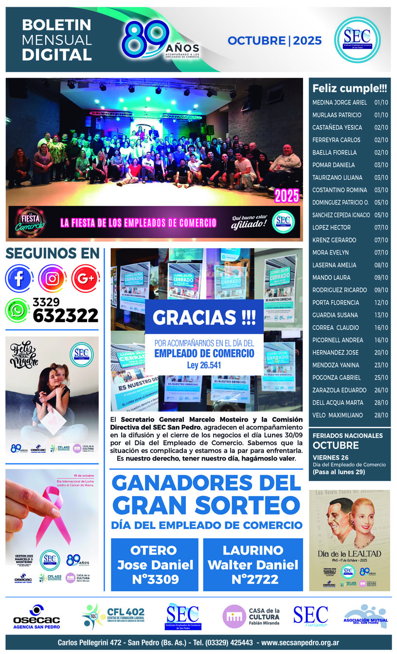 Este aniversario del sindicato es un hecho de gran importancia para quienes integramos la Comisión Directiva del SEC SAN PEDRO porque nos ubica entre las entidades sindicales con más antigüedad y de mayor crecimiento institucional en la localidad. Es por ello que no dejamos de trabajar y pensar nuevos desafíos, como lo son las nuevas instalaciones de calle Mitre 455 donde funciona el Centro de Capacitación, Educación CFL 402 SEC SAN PEDRO y LA CASA DE LA CULTURA del SEC, en la cual nuestros afiliados cuentan con espacio especialmente diseñado para capacitarse y realizar actividades enfocadas a la Cultura; talleres de yoga, de música, de arte; etc., considerando esto un baluarte de responsabilidad social que pone en valor la composición comunitaria que debemos apuntalar desde una entidad GREMIAL como la nuestra.